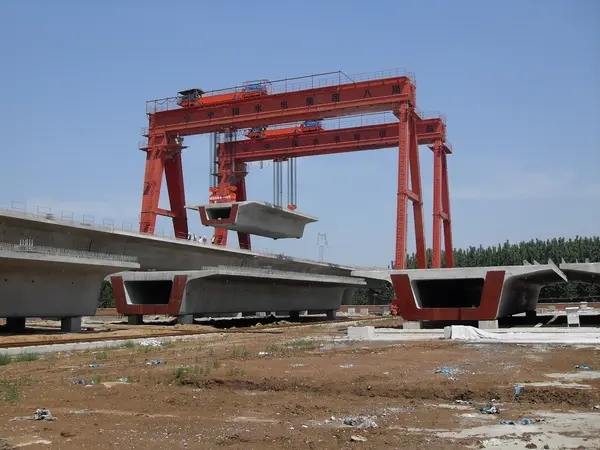 提梁機既可兩臺配合抬吊預制梁,也可以單臺起重機配雙吊具起吊預制梁,兩臺同時起重的提梁機各自的起重量一般為450噸,單臺起重的提梁機起重量通常可達900噸。它配置支腿行走、天車行走及天車起吊設備,可以實現全方位機械化動作。主要用于將預制梁從制梁臺提吊至存梁臺位,預制梁養護完成后將其從存梁臺位吊運到運梁車上。作為起重設備完成架橋機的組裝和拆卸。還用于架設墩身不高的旱橋