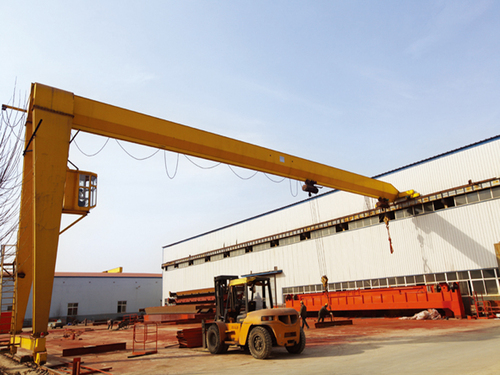 電動葫蘆半門式起重機是有軌運行的中小型起重設備,主要由門架(主梁、支腿、下橫梁等)、起升機構、運行機構及電控部分組成,以電動葫蘆作為起升機構,工作時沿主梁工字鋼下翼緣運行。門架一側設有支腿,沿地面軌道上運行,另一側無支腿,沿廠房上部軌道運行,其余結構和配置與MH型電動葫蘆門式起重機一致。