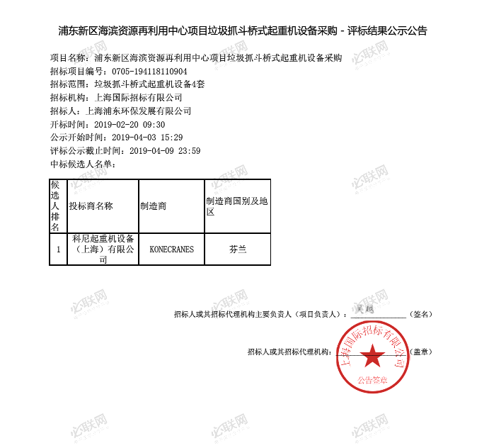 移動版:浦東新區海濱資源再利用中心項目垃圾抓斗橋式起重機設備采購中標公告