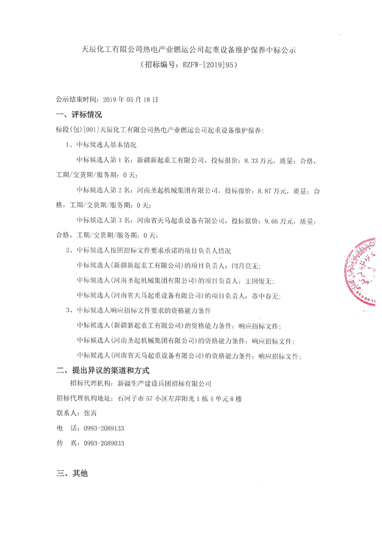 天辰化工有限公司熱電產業燃運公司起重設備維護保養中標公示