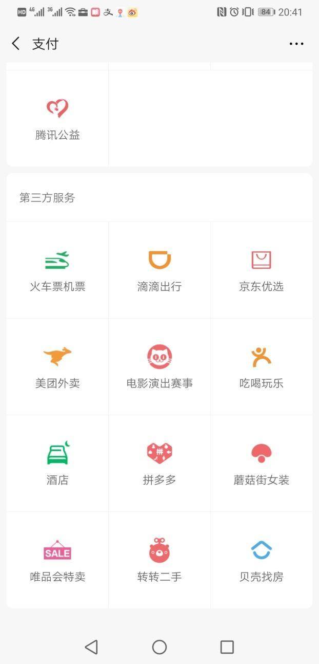 而且,你打開微信支付就能看到,在“第三方服務”的十二宮格里,同在電商領域爭食的,就有京東、拼多多、唯品會、蘑菇街4家。“馬爸爸”領養的孩子實在太多了,想給誰喂點獨食照顧一下并不容易。