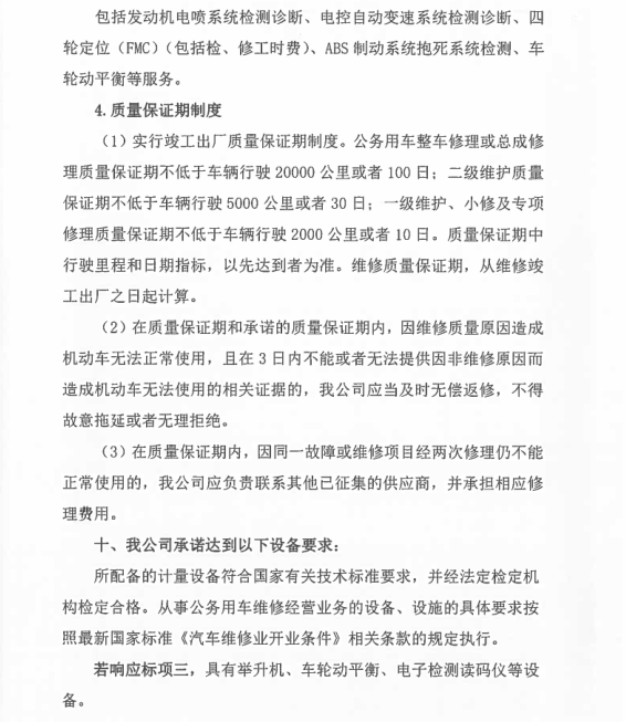16、為更好的全面周到的服務(wù)于協(xié)議單位,我司可根據(jù)協(xié)議單位車(chē)輛規(guī)模提供升降機(jī),安裝在協(xié)議單位提供的維修場(chǎng)地。并配備一定量的維修工具及常用配件。