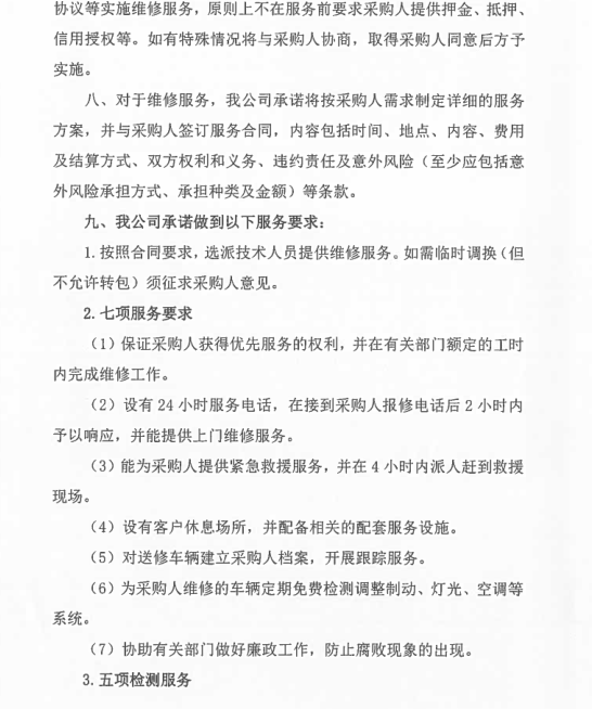 1、承諾維修時(shí)限:大修7天內(nèi);二級(jí)維護(hù)2天內(nèi);一級(jí)維護(hù)1天內(nèi)完成。