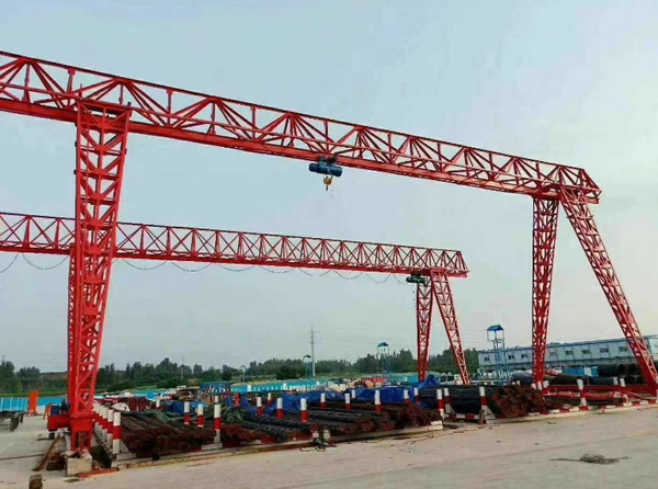 龍門吊起重機是一種橋式起重機的變形,它的金屬結構像門形框架,承載主梁下安裝兩條支腳,可以直接在地面的軌道上行走,主梁兩端可以具有外伸懸臂梁。這種起重機主要用于室外的貨場、料場貨、散貨的裝卸作業。它具有場地利用率高、作業范圍大、適應面廣、通用性強等特點,在港口貨場得到廣泛使用。